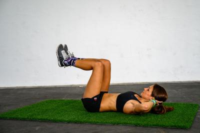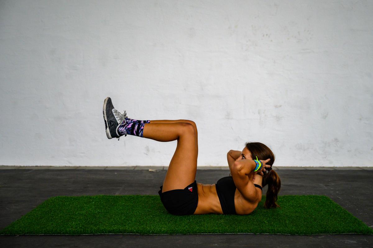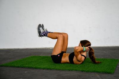 Legt euch flach auf den Rücken, die Knie in einem Winkel von 90 Grad gebeugt. Legt die Hände an beide Seite eures Kopfes. Drückt euren unteren Rücken in den Boden, während ihr die Schultern ein paar Zentimeter über den Boden hebt. Achtet darauf, dass euer unterer Rücken jederzeit mit dem Boden in Kontakt bleibt. Spannt eure Bauchmuskeln am oberen Punkt der Bewegung fest an und kehrt dann kontrolliert in die Ausgangsposition zurück.