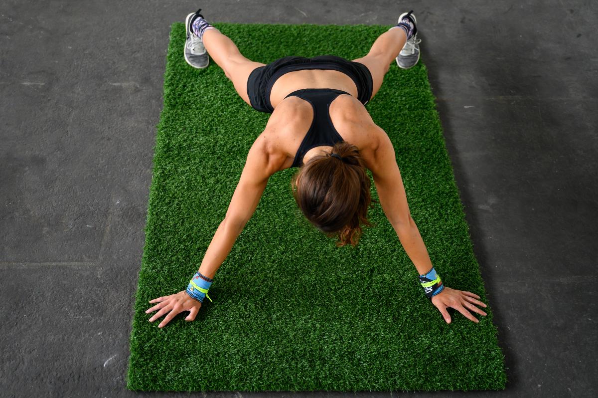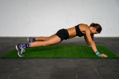 Aus der Liegestützposition heraus, bewegt eure Handflächen und Zehen nach außen und vom Körper weg, bis ihr eine X-Form gebildet habt. Spannt die Körpermitte an, sodass eine flache Linie zwischen Kopf, Hüfte und Zehen entsteht. Haltet die Position für 60 Sekunden bevor ihr wieder in eine normale Liegestützposition geht und euch nach oben drückt.