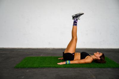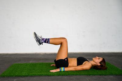 Legt euch auf den Rücken und legt die Arme mit den Handflächen nach unten auf den Boden. Beugt eure Knie und bringt sie zur Brust, indem ihr eure Bauchmuskeln zusammenzieht. Rollt beim Aufstehen euer Becken, um die Hüften vom Boden zu heben. Lasst die Beine und Hüften anschließend langsam wieder absenken, bis eure Oberschenkel senkrecht zum Boden stehen.