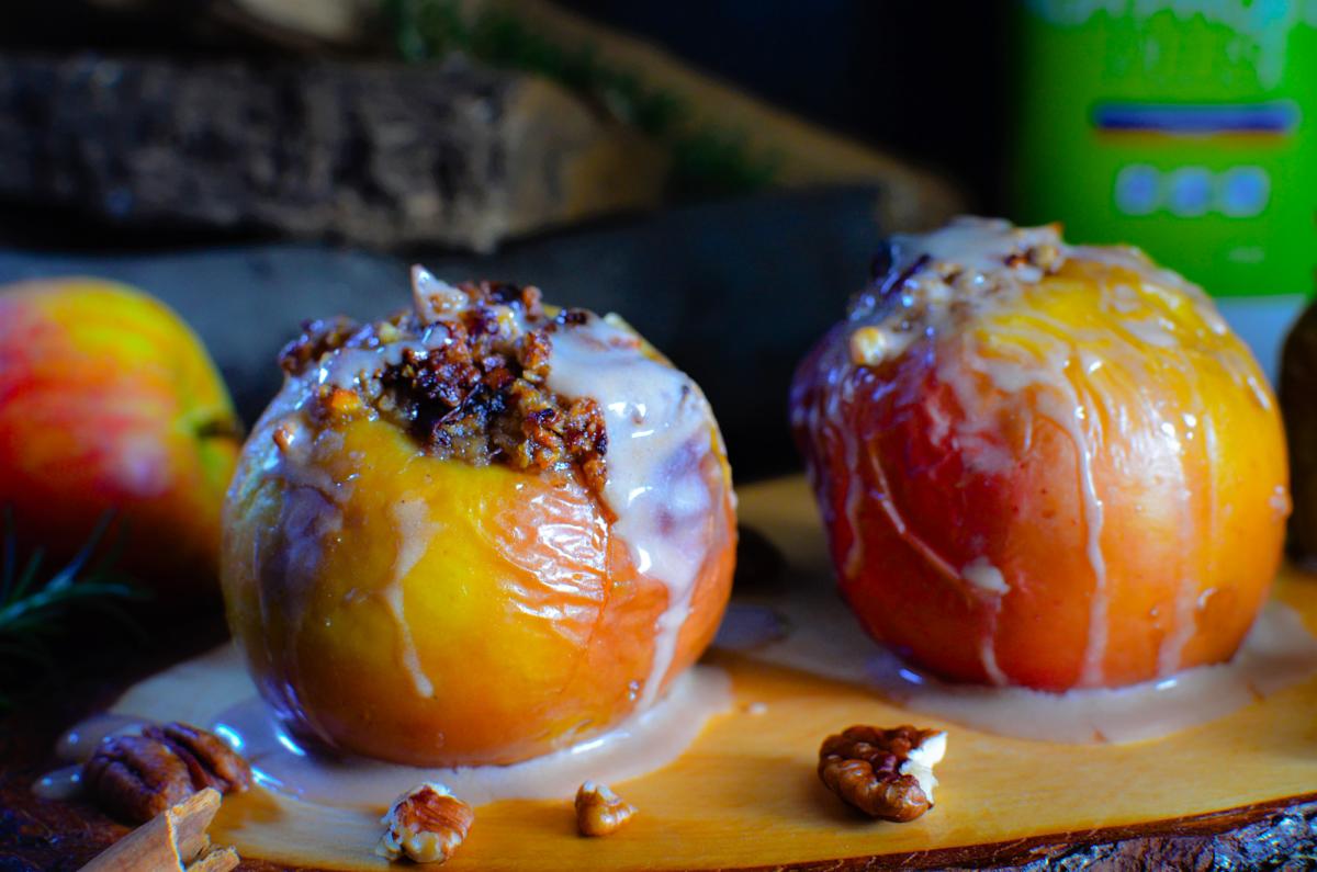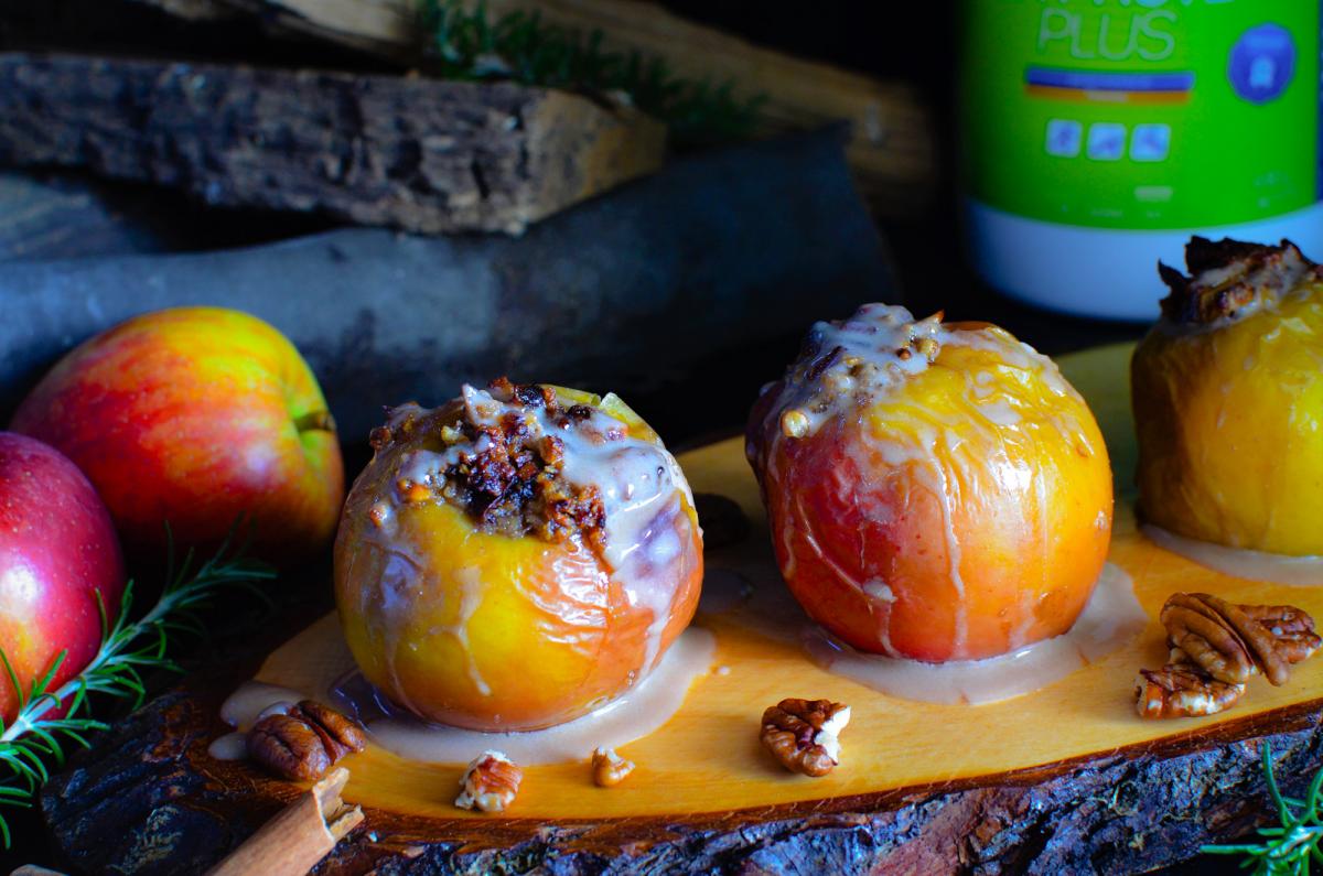 Die fertigen Bratäpfel noch warm zusammen mit der Proteinsoße servieren und je nach Wunsch mit ein paar Pekannüssen garnieren.